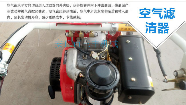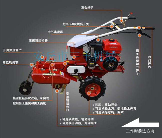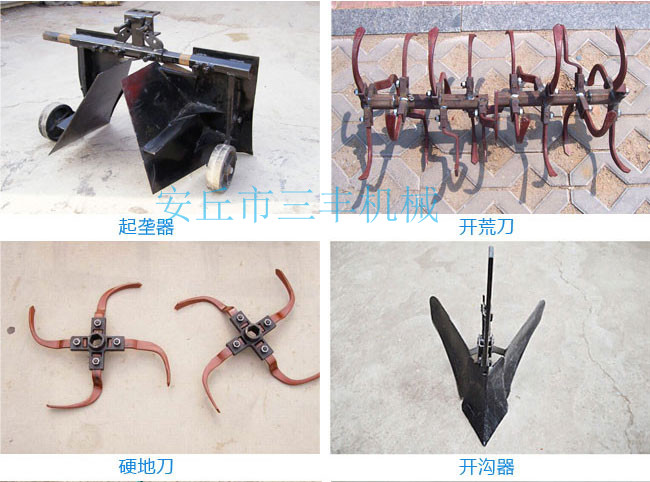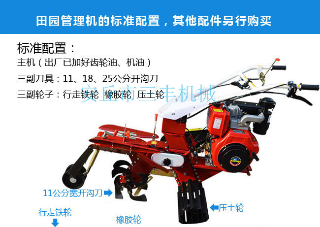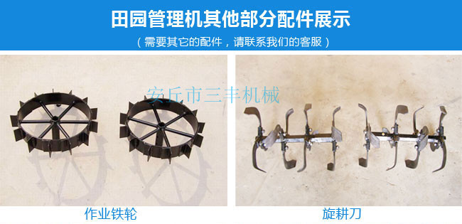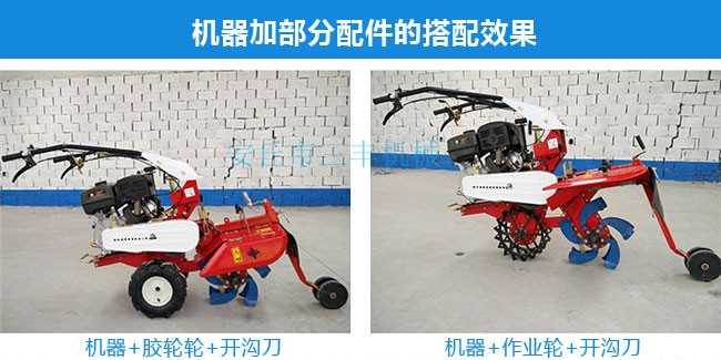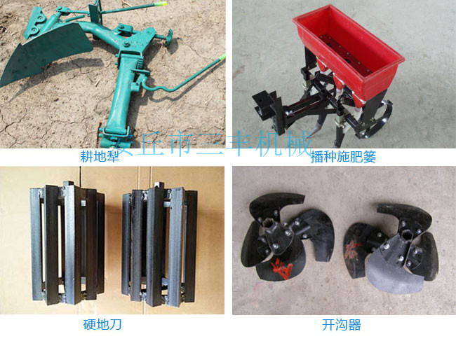 田園管理機安裝上不同的配件可以開溝、起壟、培土、打藥、播種、旋耕、松土、中耕、深耕、除草、施肥、噴藥殺蟲、噴淋、收割、鋪地膜、抽水澆地、開荒、發電、噴淋、打孔、碎草、根莖收獲、復土、開深溝、施底肥、偏培土、埋葡萄藤、扶壟、田間運輸等,與其他單一功能的田園管理機是不同的。