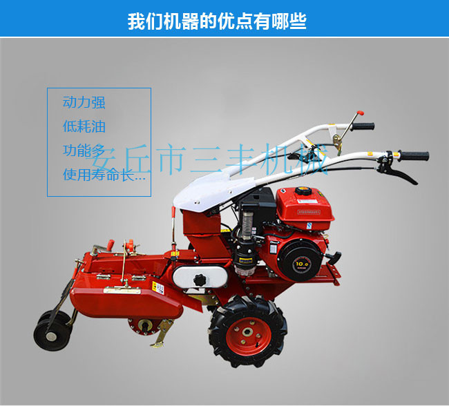 多功能田園管理機可以實現大型機械無法進入的小塊土地、大棚、茶園、丘陵、山地等不同的地形和土質進行作業。機器本身耕作不留死角,機身輕巧靈活,把手可360度旋轉,操作簡單,老少皆宜。田園管理機尤其是大蔥,大姜、土豆、煙草、甘蔗、葡萄等經濟作物的作物的開溝培土等作業,高效快捷,方便好用。現田園管理機遠銷20多個國家和地區。公司生產的田園管理機更是在國內銷售到各個地區受到了廣大農戶的一致好評。