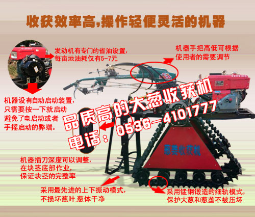 大蔥收獲機是我公司吸收國內外最先進技術,研制開發的新一代蔥姜收獲設備,是目前世界上非常先進的收獲大蔥、鮮姜的自動化根莖類收貨機械。適用于大鮮姜、大蔥、芋頭、土豆的收獲,具有自動振土,省時、省力、省錢的優點,并且具有不漏收,損耗率低,等優點比傳統人工收貨提高10倍以上,符合現代化農業發展趨勢,是你發家致富的得力助手。